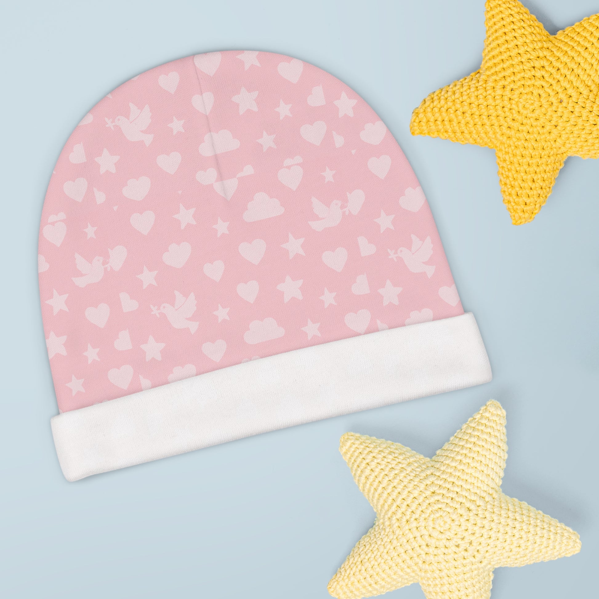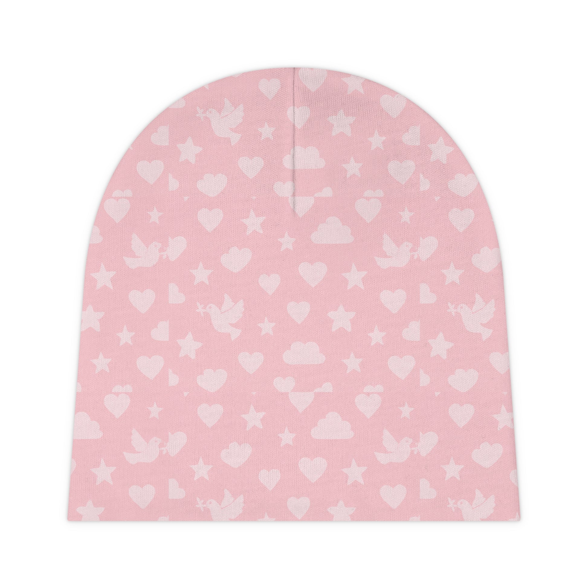 This pink Christian themed beanie featuring a dove and hearts design gives off a peaceful and loving vibe. It is perfect for infants and young children, making it a great gift for baby showers, baptisms, and birthdays.